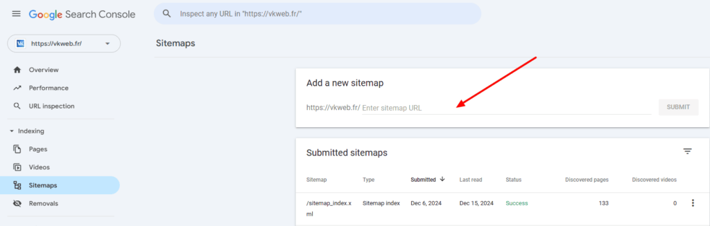 Dans la section « Sitemaps » de Google Search Console, indiquez le lien vers votre fichier sitemap.xml. Une fois soumis, ce plan sera envoyé pour vérification par Google.